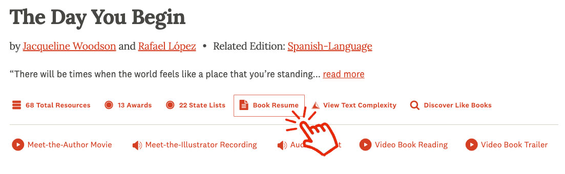 Note: Book Resumes are only available to educators and library professionals as part of paid library and school TeachingBooks accounts. Must be signed in to access.